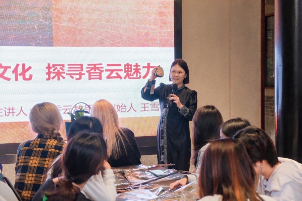 下午,师生共赴百年锦纶会馆,开展香云纱非遗技艺研学活动。香云故里集团董事长王总通过莨绸实物与影像资料,生动阐释“三洗九煮十八晒”古法工艺及“天人共作”的智慧内核,强调“敬畏非遗本真”的活化理念。学生沉浸式体验香云纱手作流程,从裁片缝制到金属铆钉组装,完成兼具传统韵味与现代功能的手作包,切身探索非遗技艺与当代设计的融合可能。