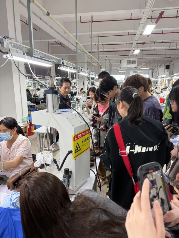 与此同时,2023级服装与服饰设计2班全体学生前往瑞龙科技服饰有限公司进行实践研学。企业聚焦“无缝制衣工艺”,总经理郭总解析“科技驱动功能服饰革新”战略定位,展示工艺升级路径。师生深入无尘车间,观摩运动功能服饰从原料到成品的全流程工艺,重点关注热熔粘合与超声波焊接技术——通过高分子材料融合替代缝线,实现服装零线迹一体化成型。学生近距离观察TPU复合面料精密热压成无缝冲锋衣的全过程,切身感受技术突破对产品形态的重构力量。