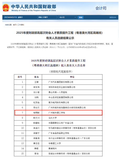 本网讯(记者 黄凤娟)4月24日,财政部公布了2025年度财政部高层次财会人才素质提升工程(粤港澳大湾区高端班)入选名单。我校122cc太阳集成游戏杨明晖教授成功入选,成为本次入选名单中唯一来自民办高校的会计学者。