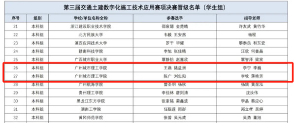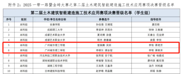 我校共选派出7支队伍参赛,其中在第二届土木建筑智能建造施工技术应用赛项中,由曾展鹏、吴圳同学组成的团队(市政管线道智能建造专业方向),李晓东、顾金锭同学组成的团队(土木建筑智能建造专业方向)分别以总分第五、第六的成绩斩获一等奖。