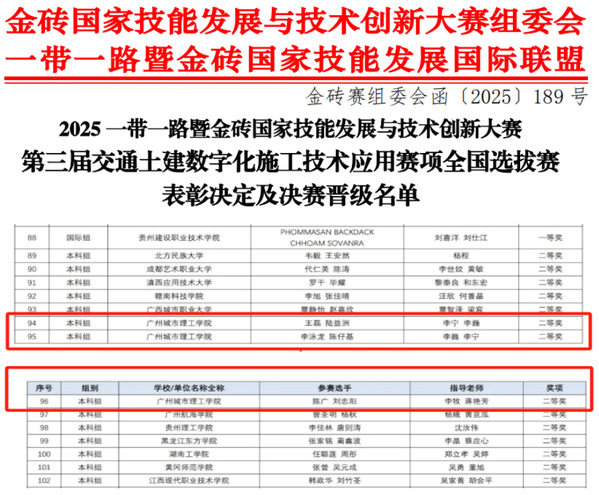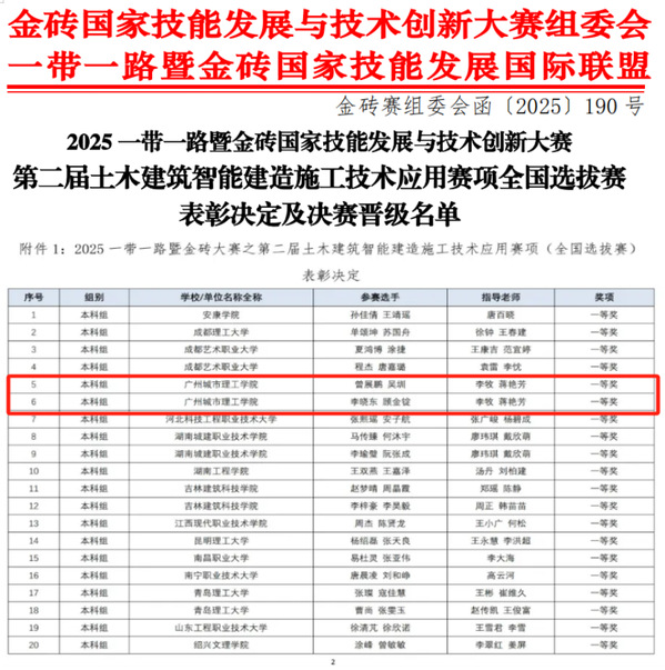 本讯网(记者 蒋艳芳)6月11日,2025“一带一路暨金砖国家技能发展与技术创新大赛”全国选拔赛圆满落幕。我校在“第二届土木建筑智能建造施工技术应用赛项”和“第三届交通土建数字化施工技术应用赛项”中表现亮眼,共斩获一等奖2项、二等奖3项,并有4支队伍成功晋级9月份的全国总决赛,展现了学校在工程教育领域的强劲实力和人才培养成效。