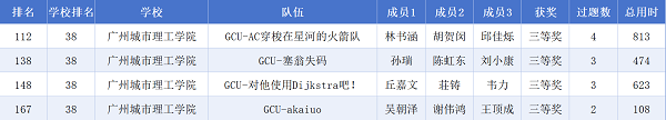 本网讯(记者 陈雪松)6月9日,2025年(第二十二届)广东省大学生程序设计竞赛(GDCPC)成绩发布。我校计算机工程学院/大数据学院的GCU-AC穿梭在星河的火箭队(团队成员:胡贺闵、邱佳烁、林书涵)、GCU-塞翁失码(团队成员:刘小康、孙瑞、陈虹东)、GCU-对他使用Dijkstra吧!(团队成员:韦力、丘嘉文、荘铸)、GCU-akaiuo(团队成员:谢伟鸿、吴朝泽、王顶成)4支队伍表现出色,斩获铜奖。这是我校自2022年以来,连续4年在广东省大学生程序设计竞赛中获奖,也是我校首次在该赛事中获得4枚奖项。