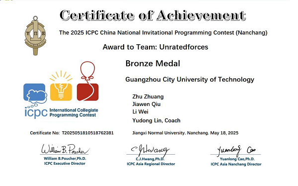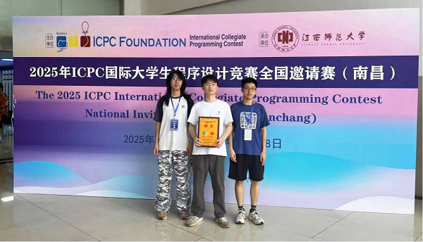 本网讯(记者 陈雪松)5月25日,我校收到2025年ICPC国际大学生程序设计竞赛全国邀请赛(南昌)证书,来自计算机工程学院/大数据学院2023级ACM特色实验班的学生荘铸、丘嘉文、韦力,在比赛中表现出色,获得铜奖。