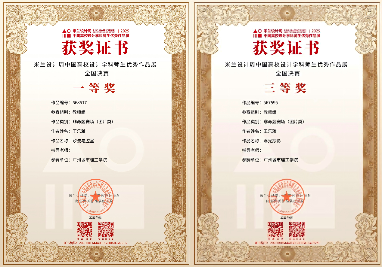 建筑学院王乐雅老师摄影作品《汐流与腔室》获得全国赛一等奖、《浮光掠影》获得全国赛三等奖,并受组委会邀请作为获奖代表上台领奖。王乐雅主讲建筑设计、建筑摄影、流媒体技术及其应用等相关课程,自2022年到建筑学院任教以来,先后指导学生获得未来设计师·全国高校数字艺术设计大赛全国赛二等奖、“米兰设计周-中国高校设计学科师生优秀作品展”广东赛区三等奖,获得广东省环境艺术设计大奖优秀指导教师等多项荣誉,凸显了我校青年教师优秀的专业素养和过硬的专业技能。