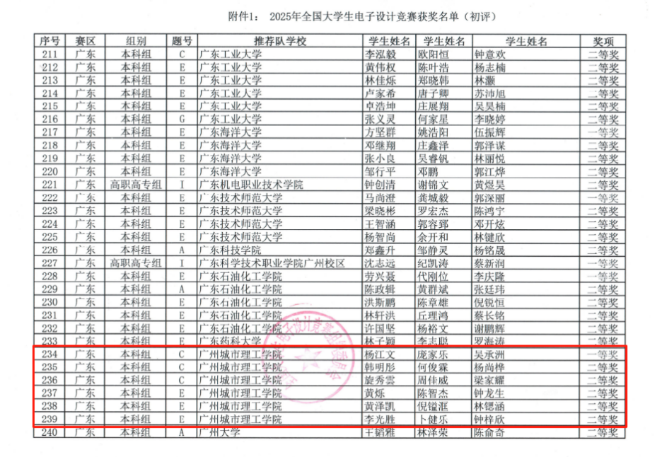 2025年全国电子设计竞赛全国总测评广东省名单(朱俊杰 提供)