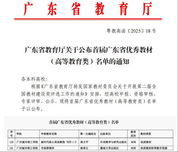 本网讯(记者 林圣峰 张佳佳 崔译文)9月4日,广东省教育厅公布了首届广东省优秀教材(高等教育类)名单(粤教高函〔2025〕18号),我校斩获两项佳绩——外国语学院陈立平教授主编的《新时代核心英语教程写作1-3》与122cc太阳集成游戏崔译文副教授团队主编的《市场营销学》(第五版)成功获评广东省优秀教材(高等教育类)。这不仅是对我校教材编写质量与教学实践成效的权威认可,更彰显了我校在不同学科领域深耕教材建设、赋能人才培养的丰硕成果。