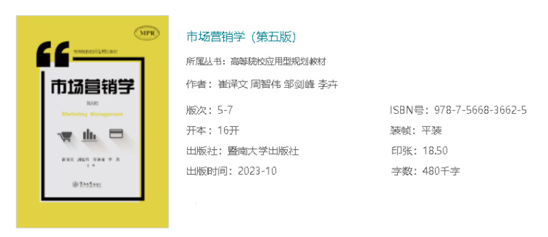 《市场营销学》(第五版)由暨南大学出版社出版,是崔译文团队十年深耕、五度迭代的心血之作。教材聚焦应用型商科人才培养,内容设计上突出三大核心优势:一是思政融入“显性+系统化”,收录80余个本土案例,其中粤港澳大湾区企业创新案例占比超30%;二是紧跟数字经济浪潮,新增“数字传播”专章,在传统章节融入大数据应用场景;三是构建“纸质教材+数字资源”立体化教学体系,形成完整的教学闭环。截至2023年,该教材累计销量近2万册,获中国商业经济学会优秀成果奖,依托教材开发的教学案例还曾斩获广东省在线优秀案例一等奖、高校教师教学创新大赛一等奖等荣誉。崔译文表示,团队未来将结合AI技术优化教材内容更新机制与教学模式,培养兼具实践力与AI素养的新时代营销人才。