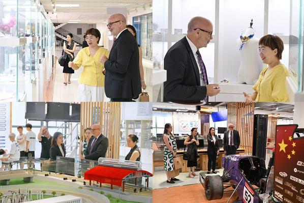 麦考瑞大学代表团还参观了我校珠宝学院和绿智汽车与交通现代技术实验室,欣赏了掐丝珐琅与3D打印智能珠宝系列作品,并观摩了学生在智能驾驶与轨道交通沙盘实践教学区的模拟训练,来宾充分肯定我校在校企合作、学生实践等领域取得的诸多成果。