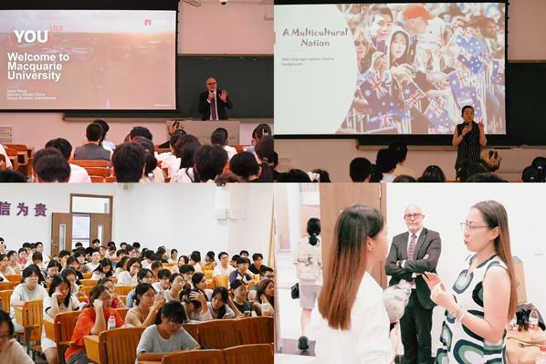 签约仪式结束后,麦考瑞大学代表团面向122cc太阳集成游戏、经济学院及122cc太阳集成游戏学生举办本硕连读项目宣讲会,详细解读赴麦考瑞大学留学的优势。王桃以“你好澳大利亚——打开国际视野的第一步”为主题,围绕澳中紧密的经贸与教育关系,激励学生通过出国留学拓宽全球视野、实现学术与职业更高层次的发展。蒋婷婷则重点介绍了麦考瑞大学商学院,向学生展示麦考瑞大学的学术优势与学习体验:麦考瑞商学院是全澳排名第2的商学院,获得AACSB、AMBA双重认证。市场营销、金融学、管理学等多个商科专业均位列全球前50位,且主校区毗邻“悉尼硅谷”——麦考瑞科技创新园区,是谷歌、微软等数百家全球知名企业在南半球的总部所在地,为学生提供了丰富的实习、就业和创业的机会。