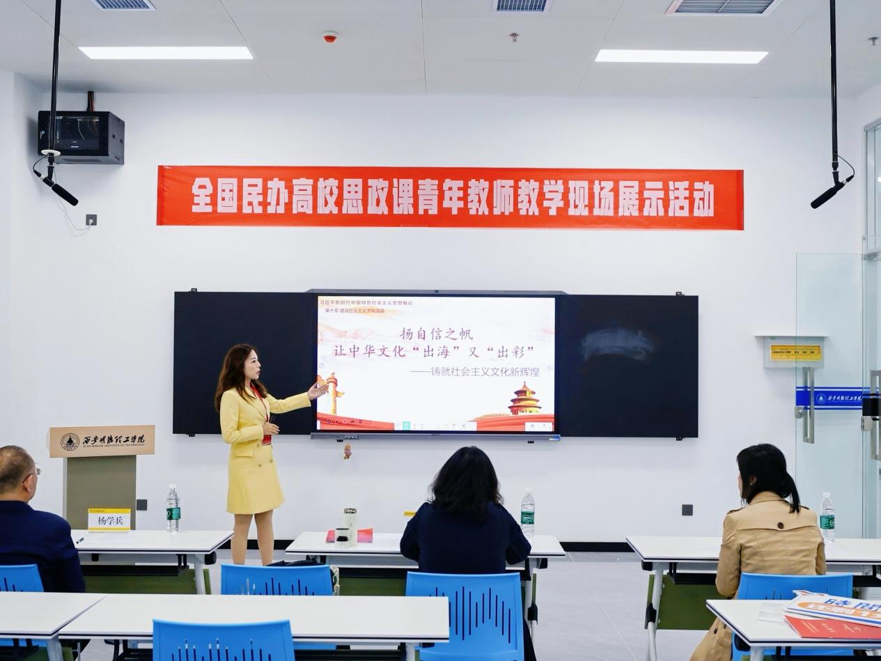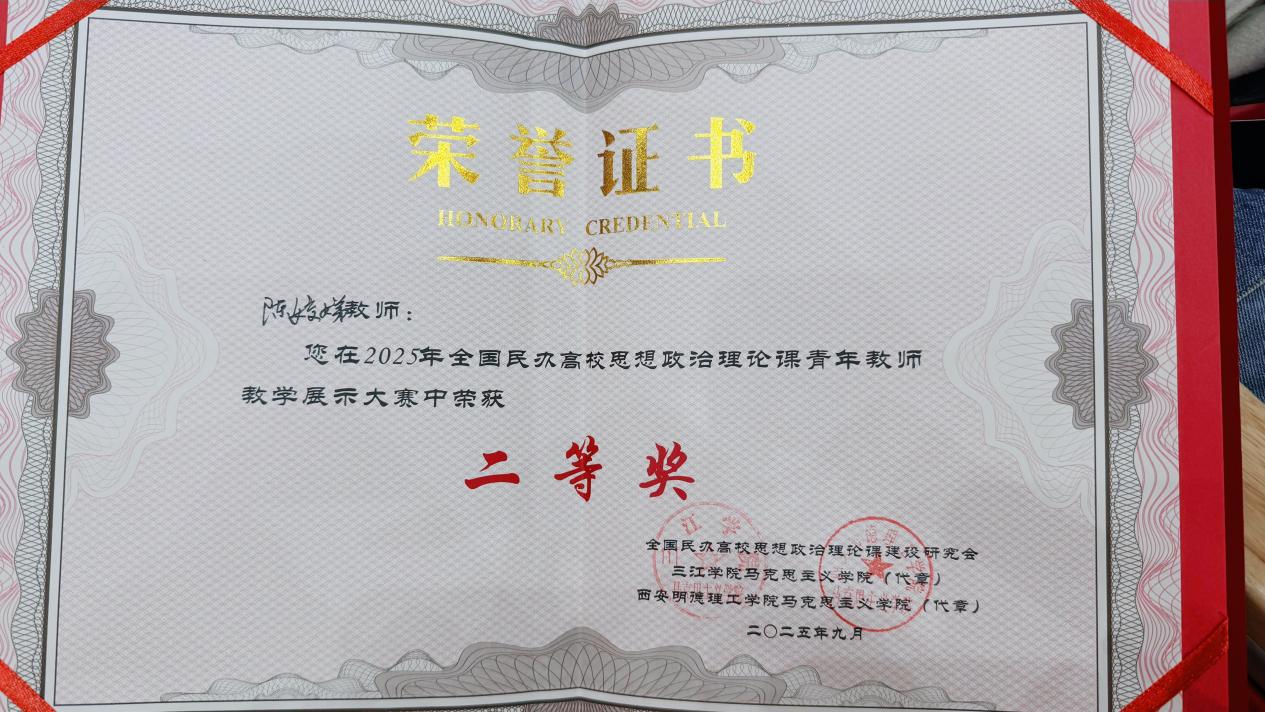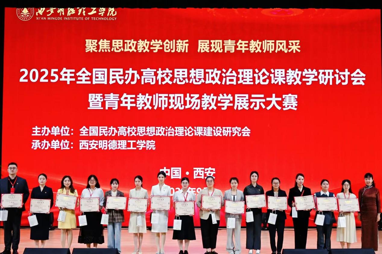本网讯(记者 陈姣娣 沈秋娜)为加强全国民办高校思想政治理论课教师队伍建设,推动思想政治理论课改革创新,提升青年教师教学能力和水平,9月21日,由全国民办高校思想政治理论课建设研究会主办、西安明德学院承办的全国民办高校思想政治理论课教学研讨会暨青年教师现场教学展示大赛在西安落下帷幕。我校马克思主义学院教师陈姣娣表现优异,从全国164名参赛选手中脱颖而出,斩获二等奖。