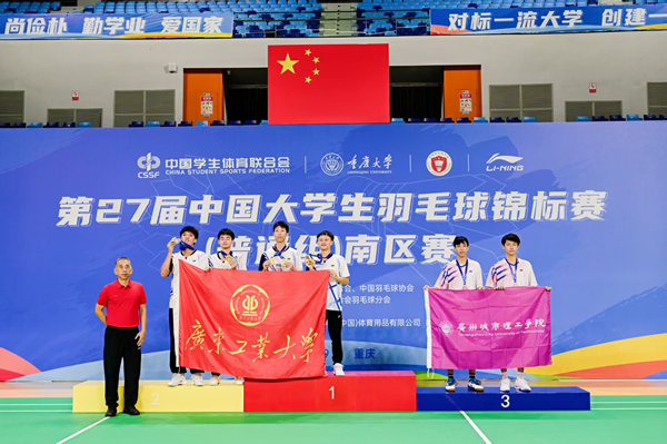 本网讯(记者 傅文涛)9月26日,第27届中国大学生羽毛球锦标赛普通组(南区赛)在重庆大学圆满落幕,本次赛事吸引了南区包括复旦大学、华中科技大学和中山大学等44所高校的316名运动员参加。我校羽毛球队奋勇拼搏,表现卓越,朱健民和刘博深联手斩获男子双打项目铜牌,实现了学校在该项国家级赛事中奖牌零的突破,队员程朗亦荣获男子单打第六名。我校参赛的四个单项全部晋级全国总决赛。