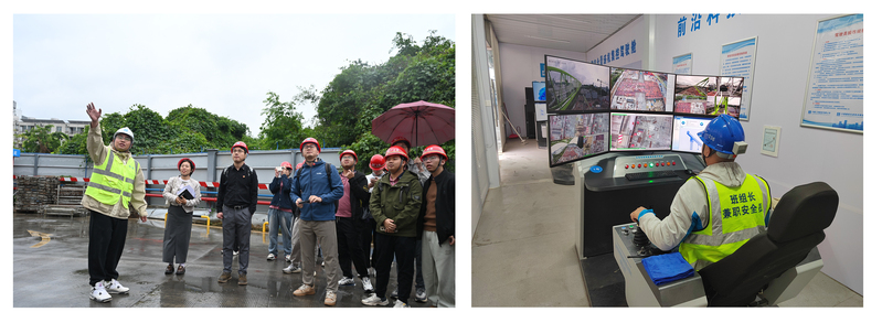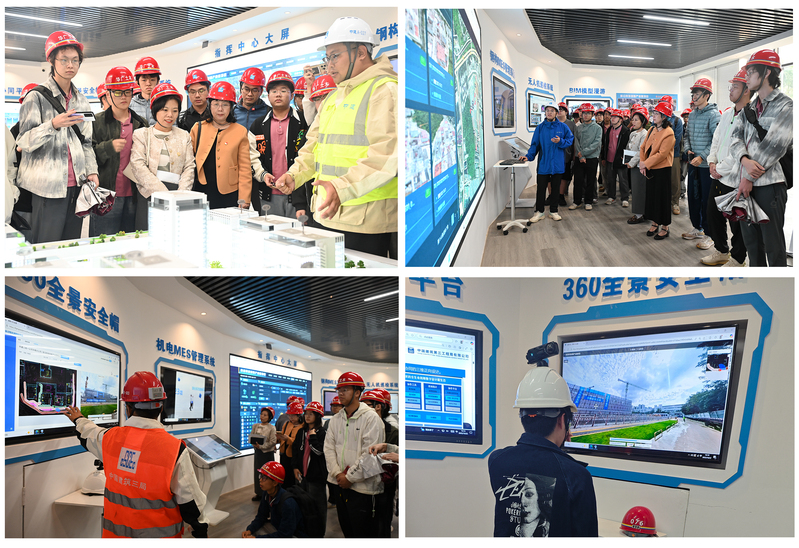 在智慧展厅,党员项目技术总工蔡立东以10#配套办公楼211m大跨度钢结构连廊为例,介绍“地面拼装、整体液压提升”工法:135m最大悬空跨度、350t单榀桁架、5mm毫米级同步误差,让同学们首次近距离感受“中国建造”精度。师生现场观摩5G智能塔机、实测实量机器人、腻子刮涂机器人及AI不安全行为识别系统,通过BIM+无人机实景模型直观了解数字孪生管理流程,“课本上的智慧工地一下子立了起来”。