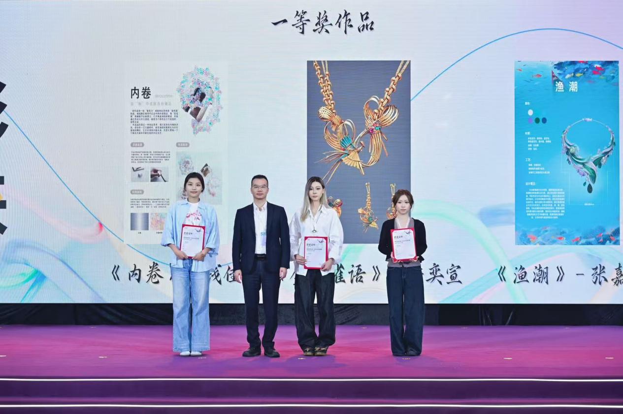 珠宝学院首饰设计教研室副主任文海和专业教师肖婷婷、魏艺带领获奖学生受邀参加本次颁奖典礼。本次赛事,珠宝学院学子余奕宣作品《金编雀语》荣获一等奖;柯哲铭作品《浪吟,海韵》荣获二等奖;姚蔚雯作品《鳞光龙韵》、刘涵作品《海洋回响》、李可泽作品《穗月流光》荣获三等奖;肖婷婷老师作品《我的自画像》荣获最佳创意奖。同时,魏艺老师荣获“优秀指导教师”,充分体现了我校“以赛促教、产教融合”的育人成效。